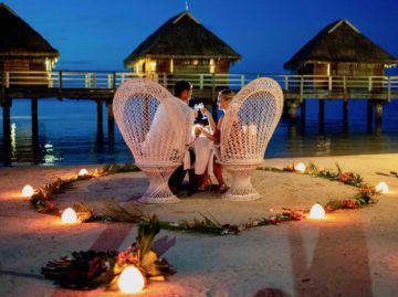 Polynesian ceremony or exceptional ceremony (American Style ) under the Tree of Love, on the beach or on the lagoon. Several options according to your preferences. Including Polynesian music, floral decoration, ceremony with the Master of ceremony or a Polynesian priest, flower necklaces, traditional white pareu, cocktails, bottle of champagne , dancers & musicians, marriage certificate, lunch “feet in the water” , wedding cake, Tahitian black pearls,..