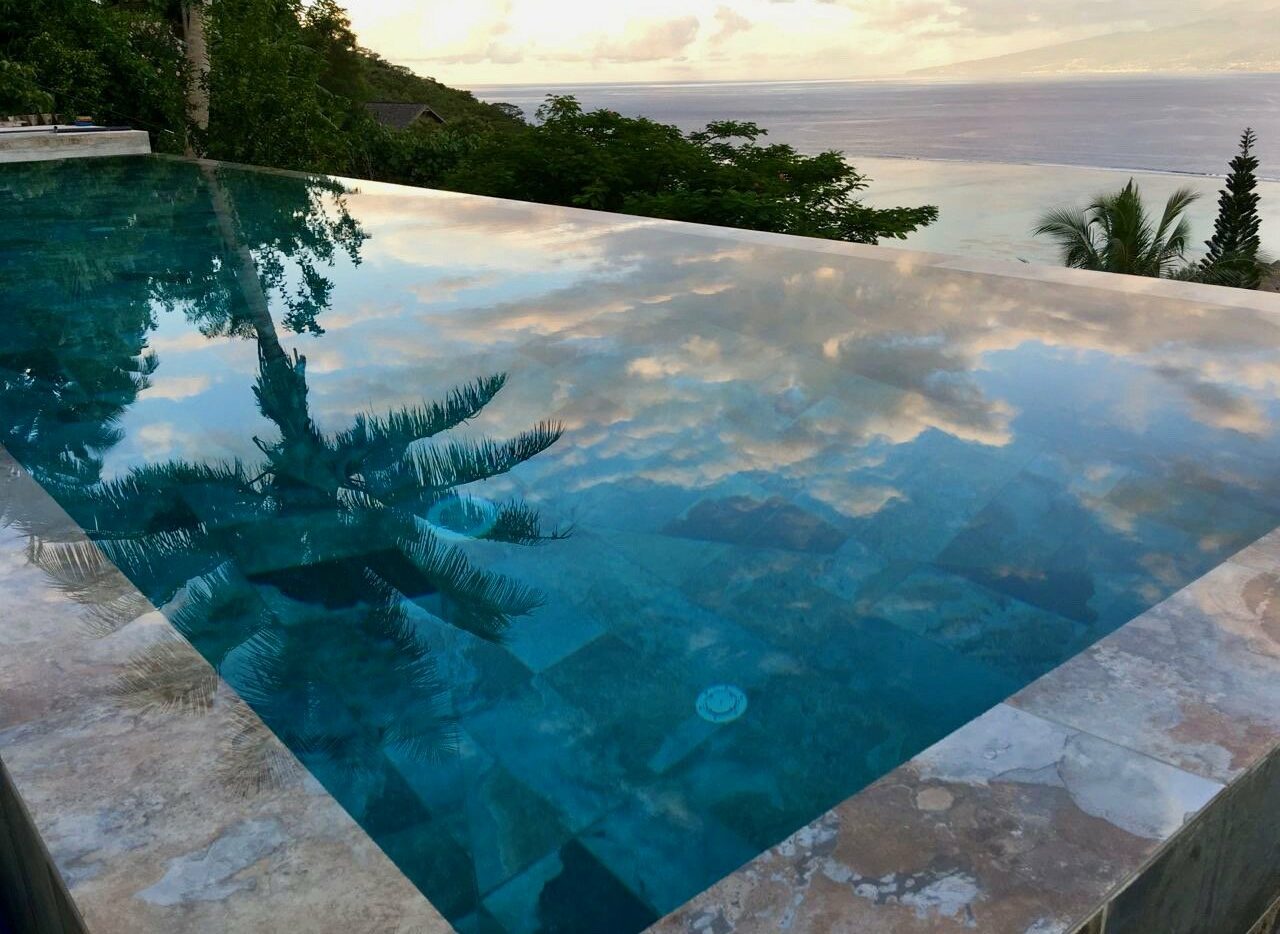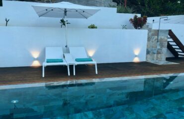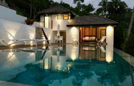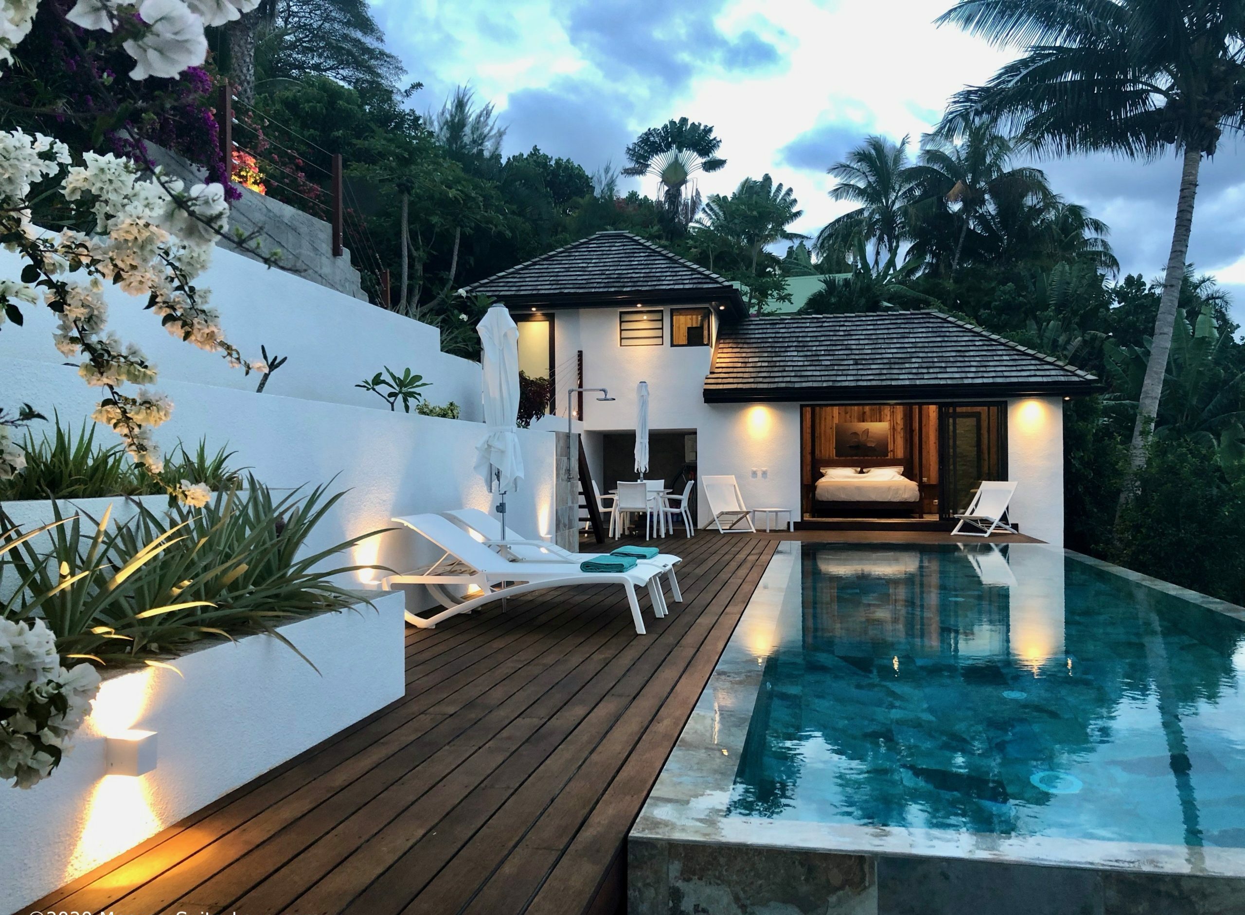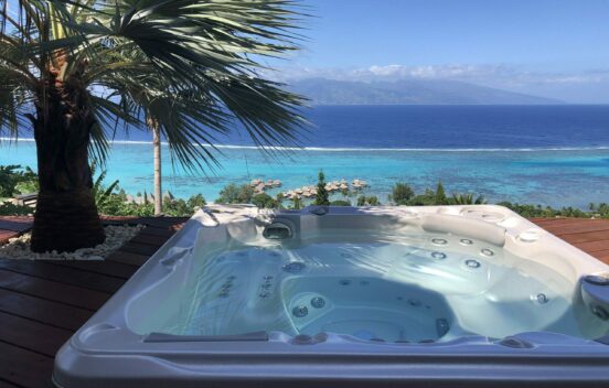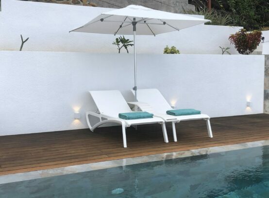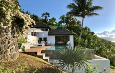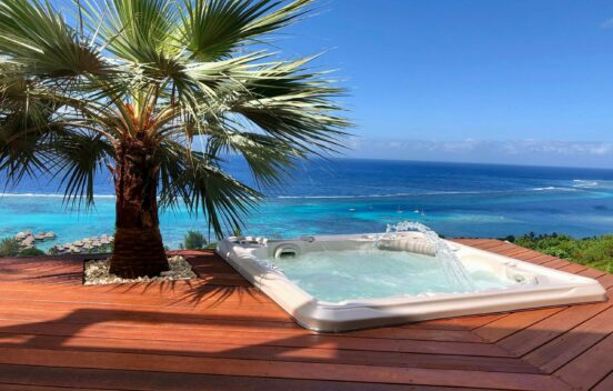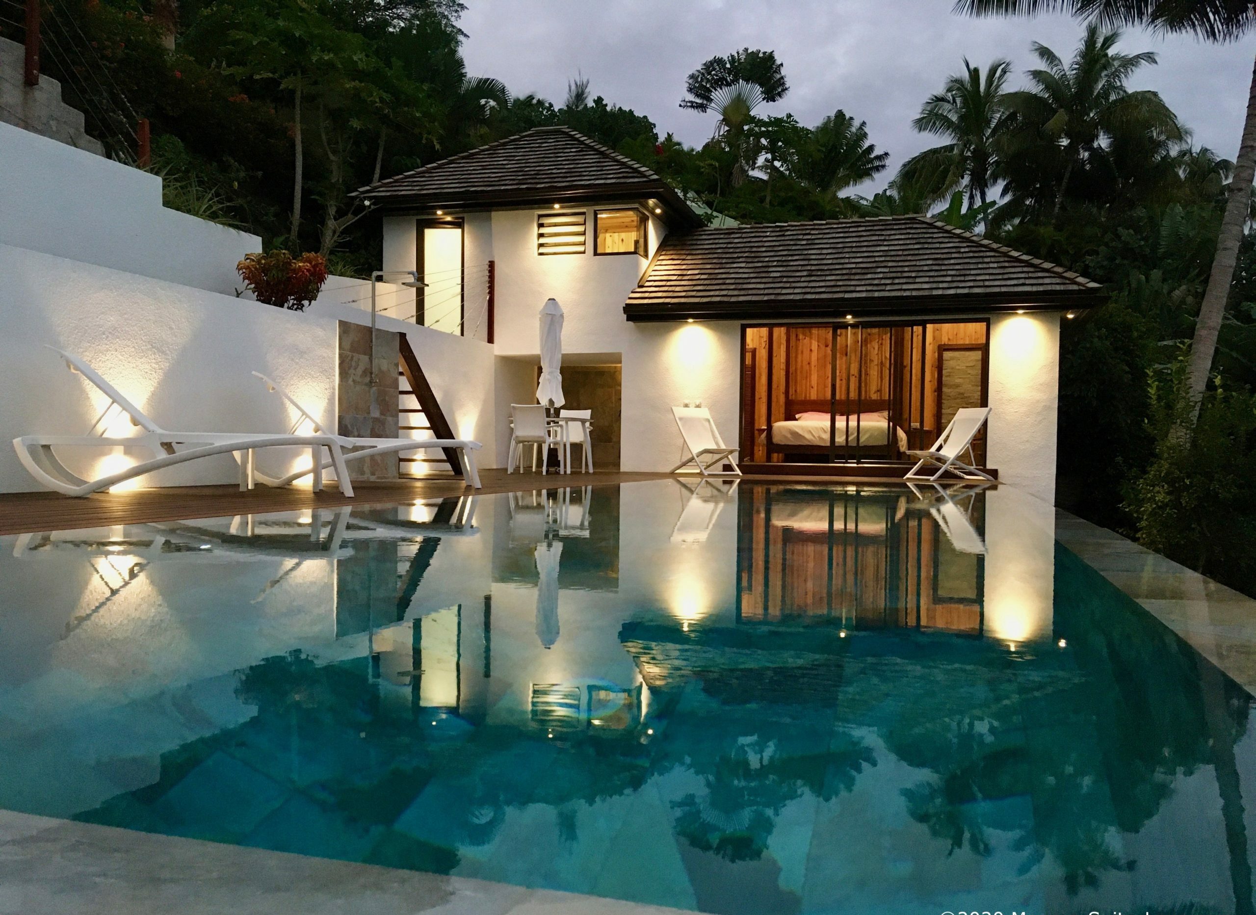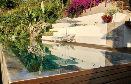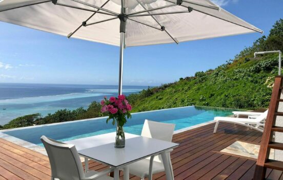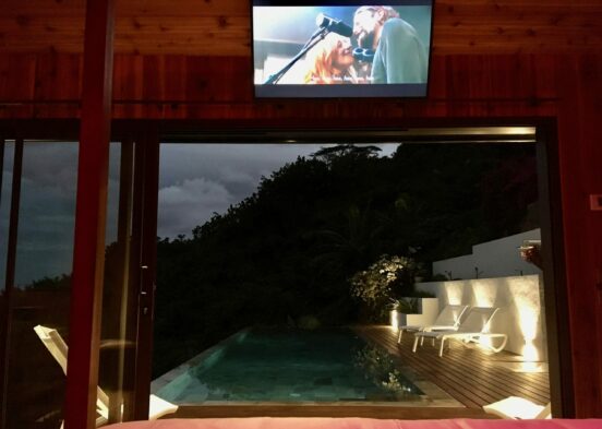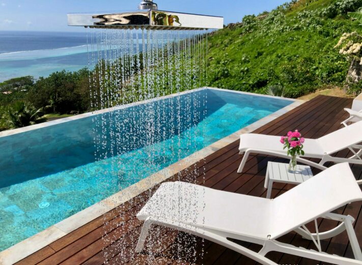 Moorea Suite Love is a spacious and luxurious mirror pool, newly built at the top of an exclusive private residence offering a breathtaking panoramic view. Perfectly integrated into its lush tropical surroundings, this elegant Suite is composed of two harmonious spaces: a romantic bedroom by the pool, and a refined bathroom overlooking the water, connected by an internal staircase. Every detail has been designed to offer comfort, privacy, and unforgettable romantic moments — both day and night, in complete serenity.