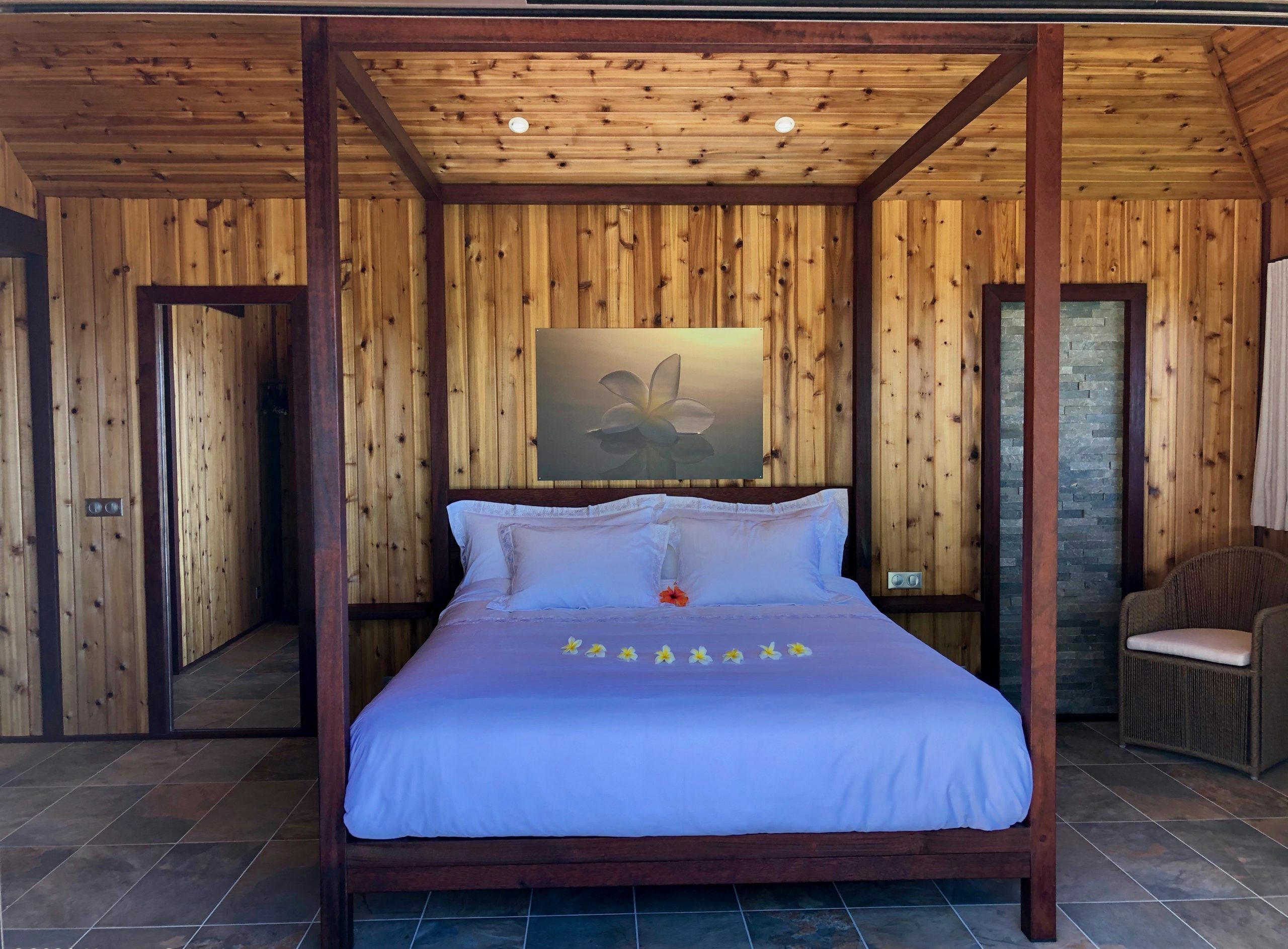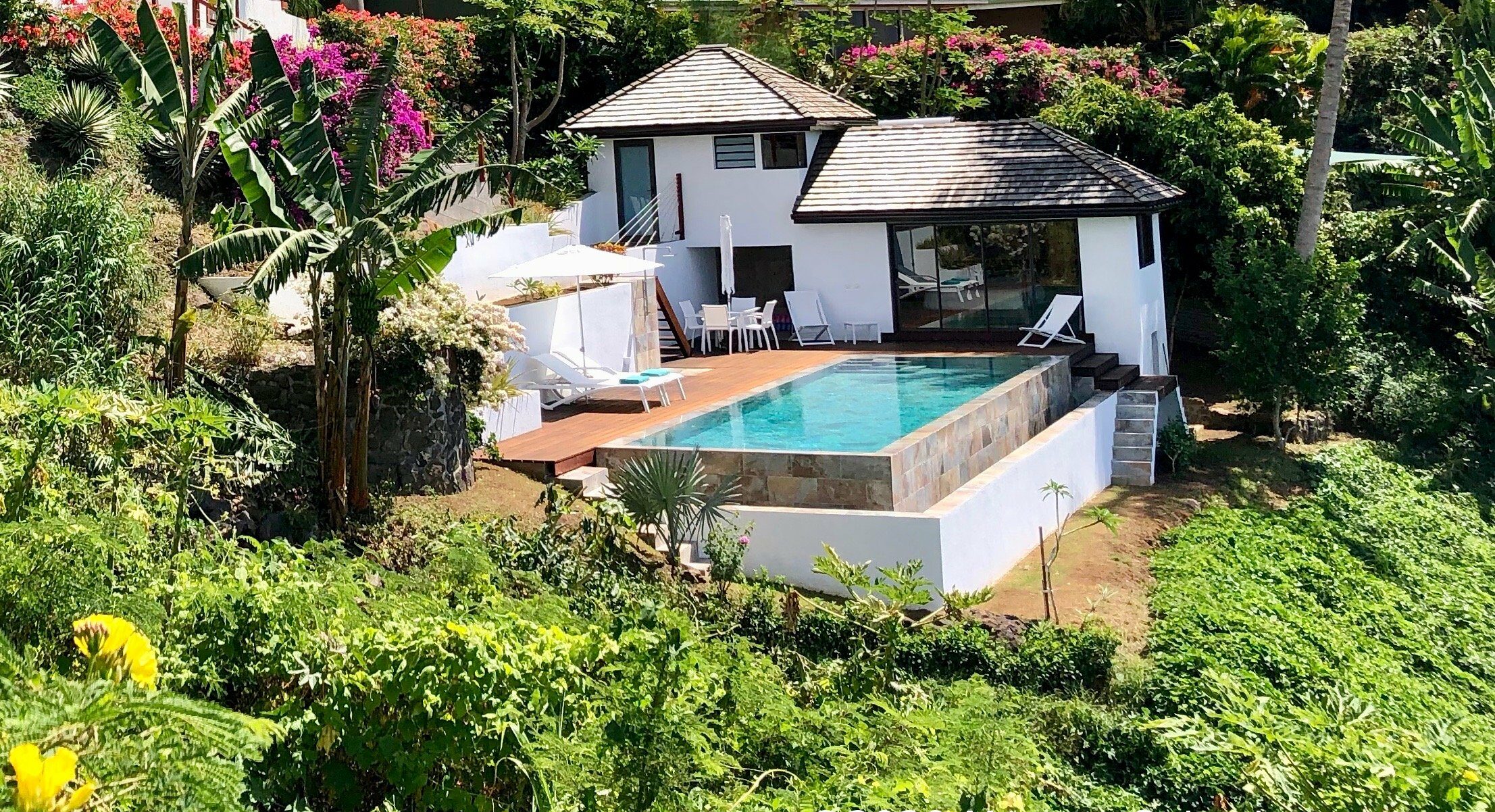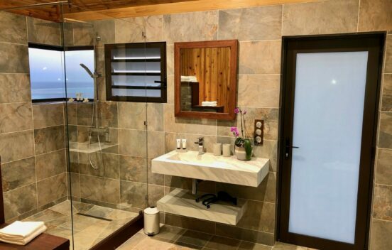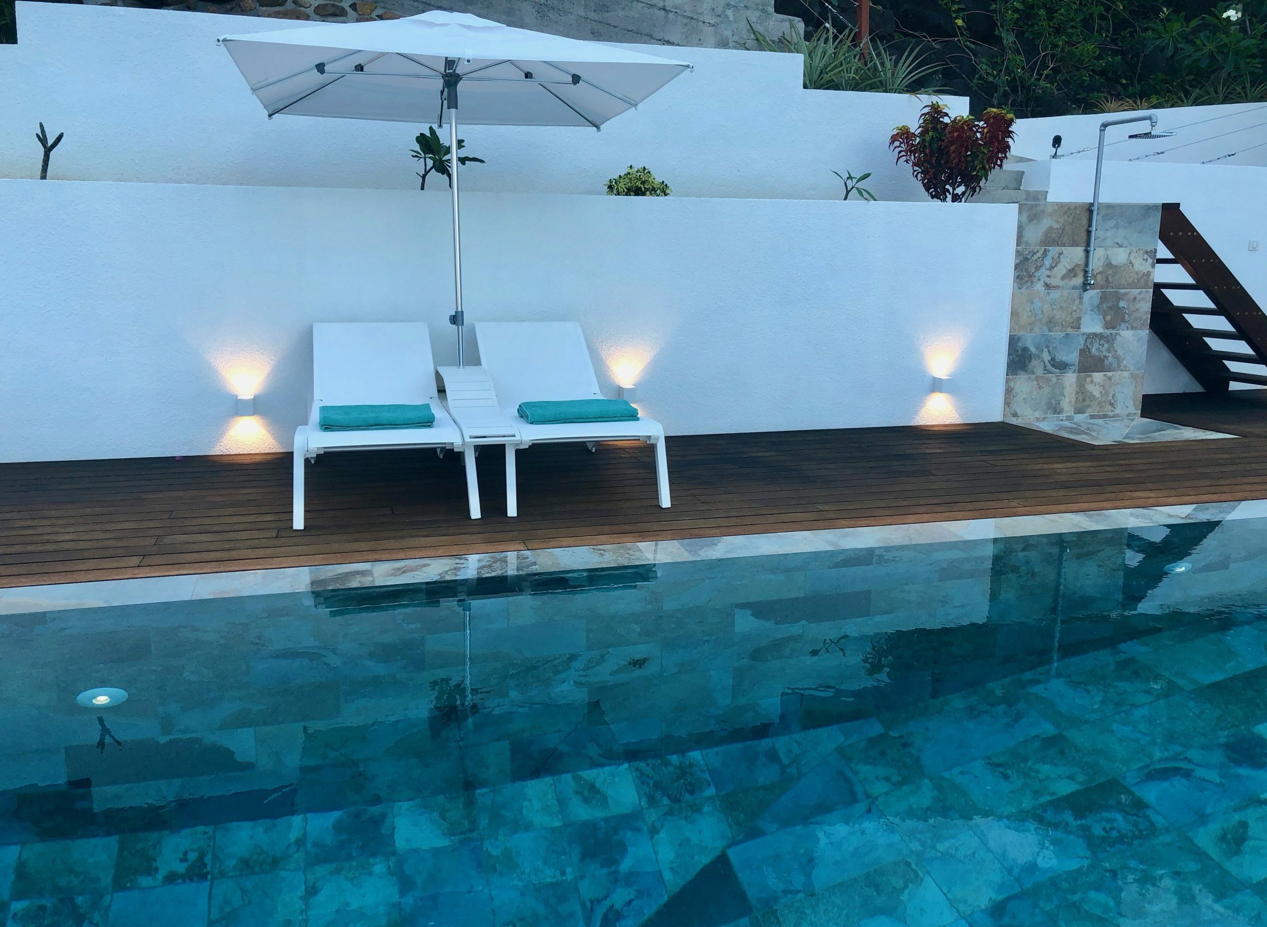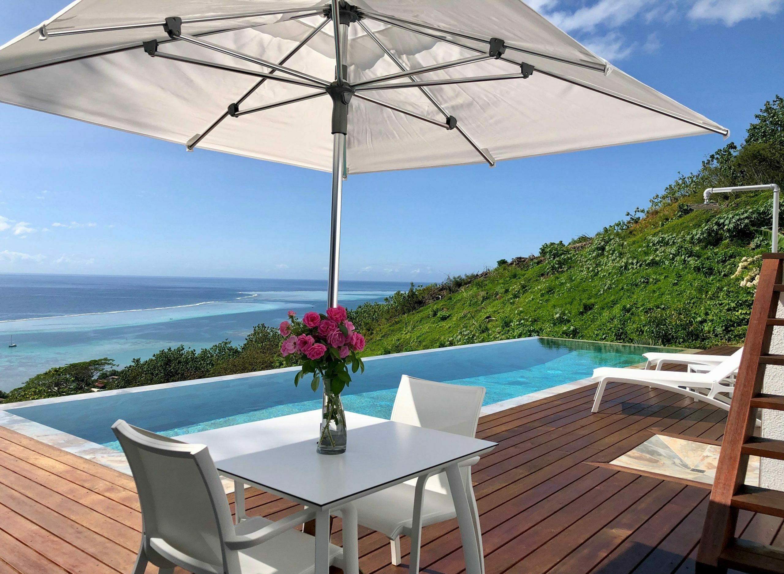 Moorea Suite Love is a spacious and luxurious mirror pool, newly built at the top of an exclusive private residence offering a breathtaking panoramic view. Perfectly integrated into its lush tropical surroundings, this elegant Suite is composed of two harmonious spaces: a romantic bedroom by the pool, and a refined bathroom overlooking the water, connected by an internal staircase. Every detail has been designed to offer comfort, privacy, and unforgettable romantic moments — both day and night, in complete serenity.