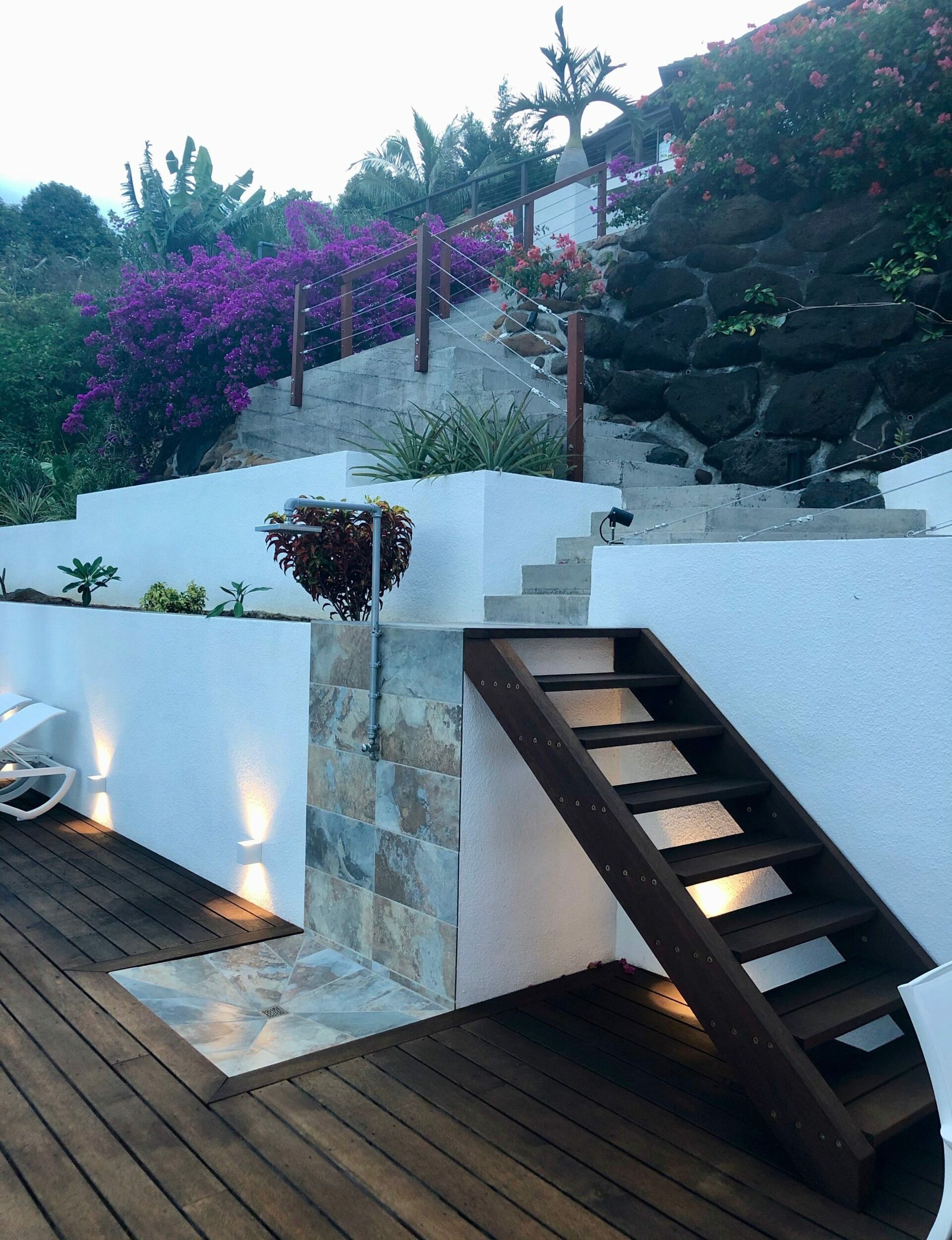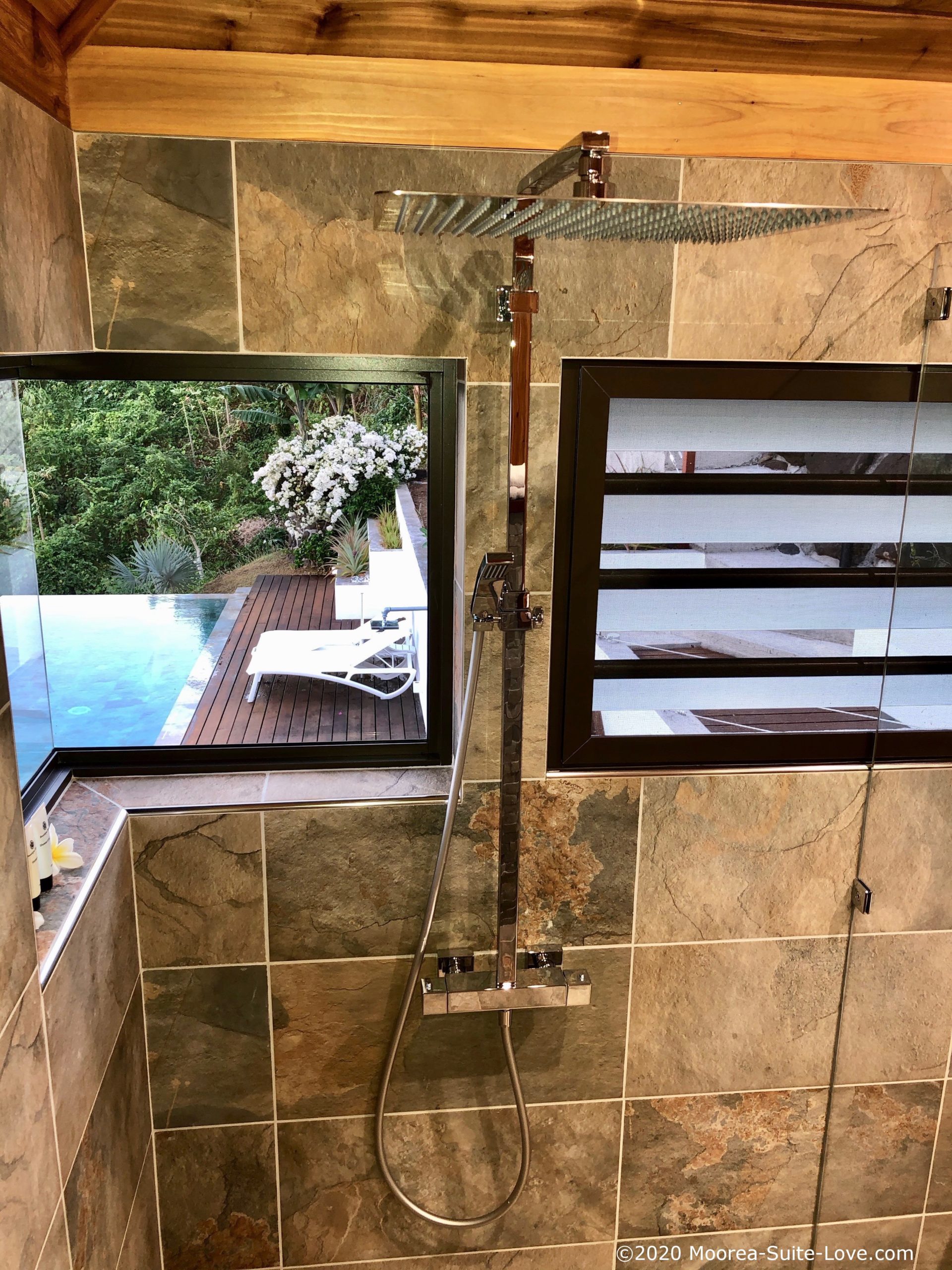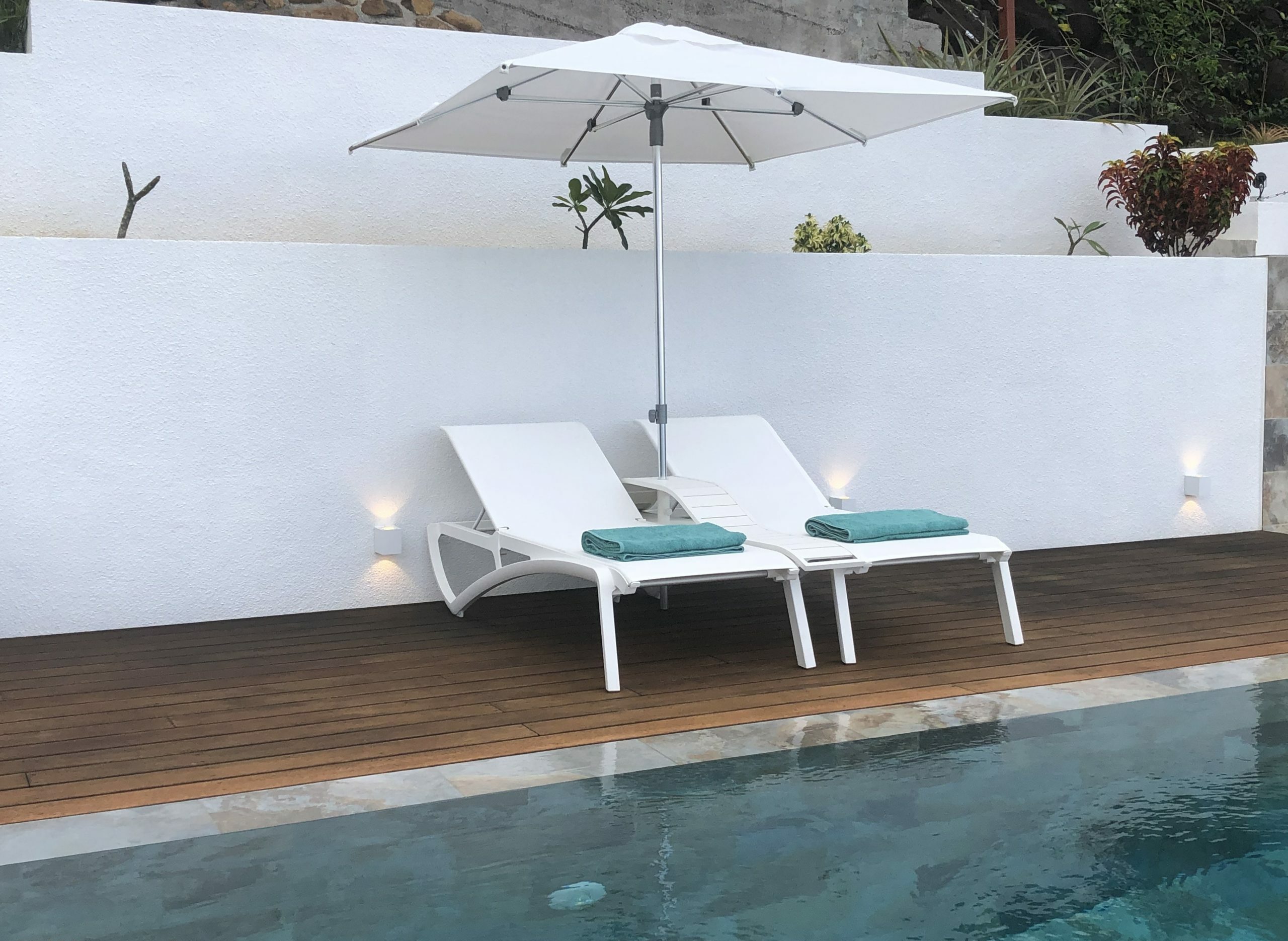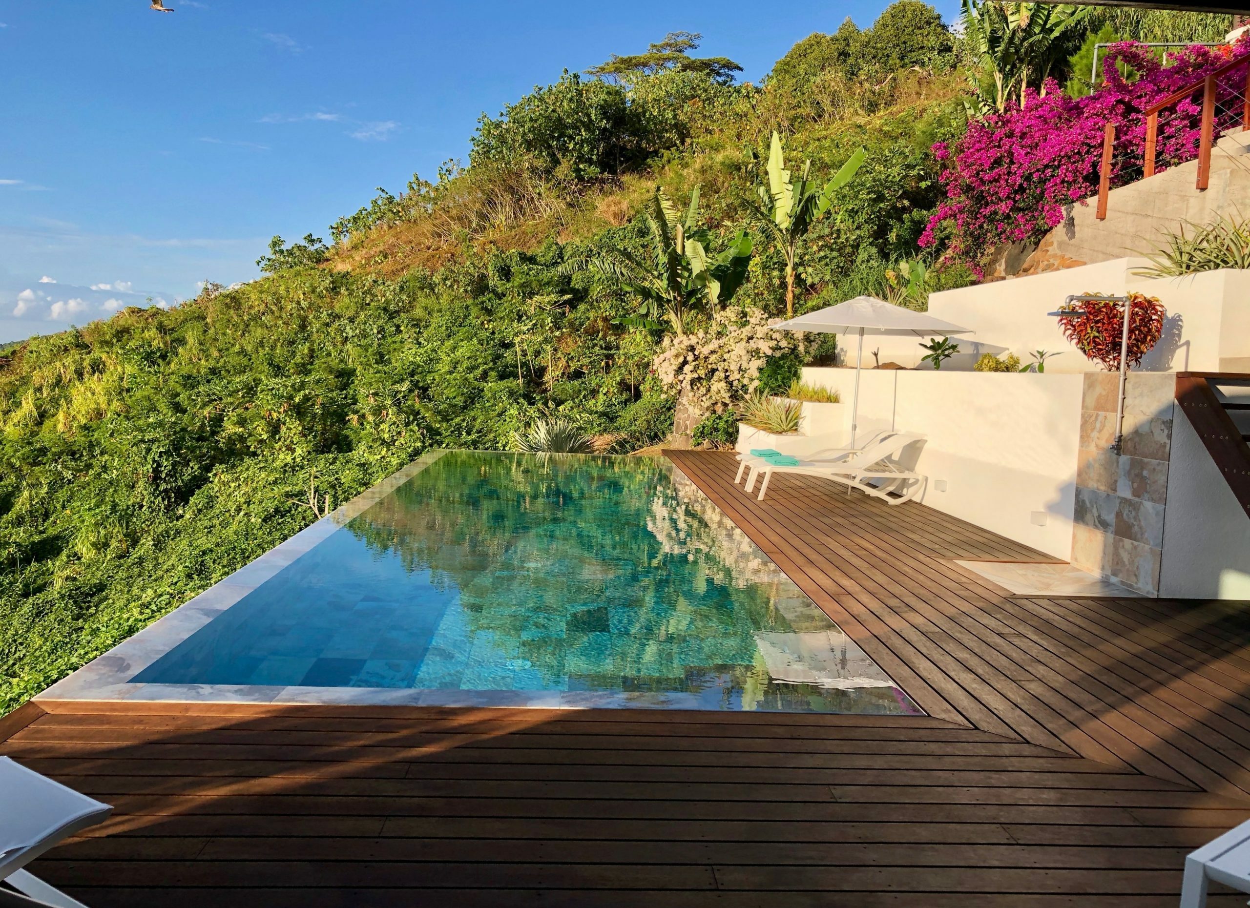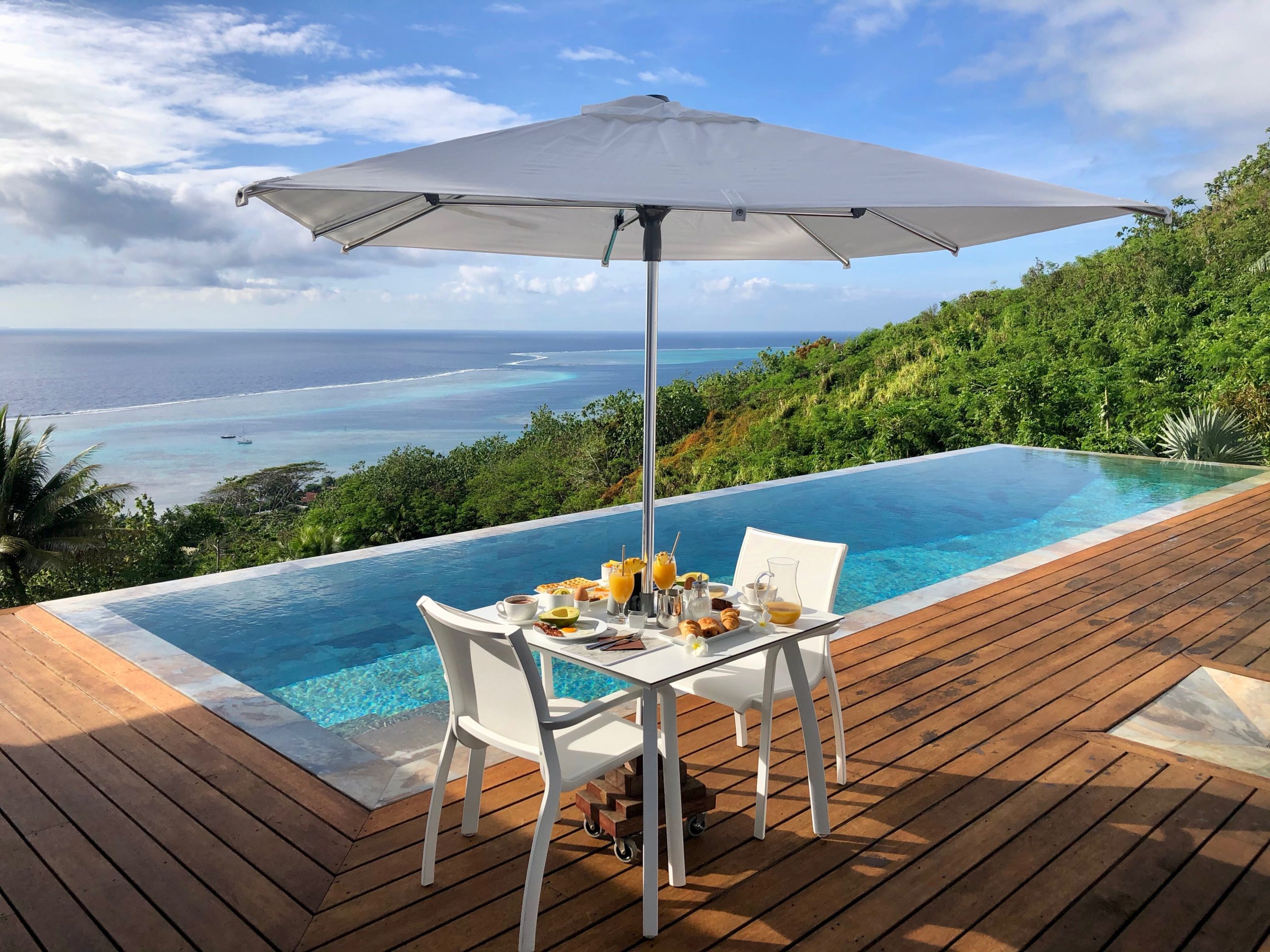 Moorea Suite Love is a spacious and luxurious mirror pool, newly built at the top of an exclusive private residence offering a breathtaking panoramic view. Perfectly integrated into its lush tropical surroundings, this elegant Suite is composed of two harmonious spaces: a romantic bedroom by the pool, and a refined bathroom overlooking the water, connected by an internal staircase. Every detail has been designed to offer comfort, privacy, and unforgettable romantic moments — both day and night, in complete serenity.